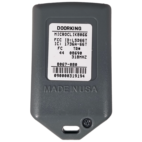 The DoorKing MicroClik 2 Button model 8067080-nn is also known as DoorKing model 8067-080. This remote is a 318 MHz 26 Bit Wiegand transmitter for gates and other doors using a MicroClik or compatible radio receiver. The MicroClik technology is designed to provide security and convenience while still allowing most luxury automobiles to program the transmitter codes directly to their vehicles. Please consult your vehicle’s manual for compatibility. DoorKing MicroClik models have serial numbers ranging from 00001 to 16000. The MicroClik remotes ARE NOT compatible with DoorKing’s black MicroPlus remotes and receivers. DoorKing remotes are constructed from high quality materials and come with a 2-year warranty.