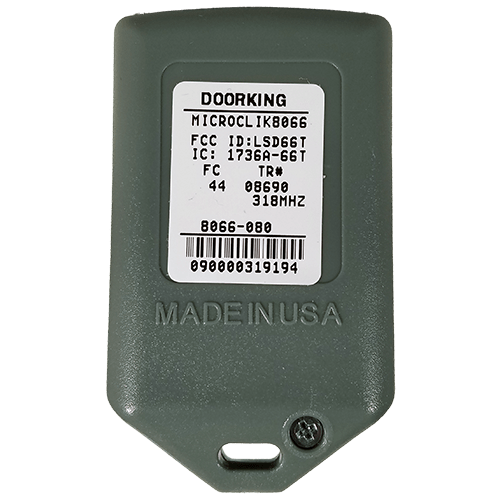 The DoorKing MicroClik One Button model 8066080-sn-a is also known as DoorKing model 8066-082. This is the special-order version. You can specify any facility code and serial numbers to match your system requirements. Door King Micro Clik remotes have serial numbers ranging from 00001 to 16000. This transmitter is a 318MHz frequency 26 Bit Wiegand remote control for gates and other doors utilizing a MicroClik or compatible receiver. Also known as PROXmtr, this version also works on AWID and compatible prox card readers with the built-in proximity chip. The MicroClik technology provides security and convenience while still allowing most luxury automobiles to program the transmitter codes directly to their vehicles. Please consult your vehicle’s manual for compatibility. The MicroClik remotes ARE NOT compatible with DoorKing’s black MicroPlus remotes and receivers. DoorKing remotes are made with quality materials and come with a 2-year warranty.