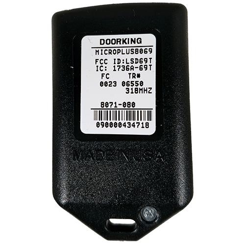 The DoorKing MicroPlus three button remote model 8071080-sn is also known as 8071-080. These remotes operate at 318MHz frequency and feature a secure encrypted rolling code technology. They are compatible with DoorKing MicroPlus gate receivers. These ARE NOT compatible with the grey MicroClik models. Custom Facility Code & Serial Numbers.