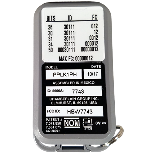 The Liftmaster PPLK1PH is a single button keychain style remote with a built-in HID Prox chip for use on HID and compatible card readers. This remote control works with Liftmaster Security+ 2.0 commercial gate/garage operators, CAPXL telephone entry units and Passport 2.0 radio receivers. NOT COMPATIBLE WITH INDIVIDUAL RESIDENTIAL GARAGE DOOR OPERATORS.