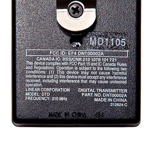 The Linear DT1 is a single button visor style remote. These transmitters operate at 310 MHz and program with eight binary (2 position) dip switches. The dt1 works with 310MHz Delta3 and other compatible 8 switch receivers. These remotes also go by the following models: DT, DTB, DTC, DTD. The metal visor clip and 9-volt battery are included. Linear transmitters are made with quality parts and come with a one-year factory warranty.