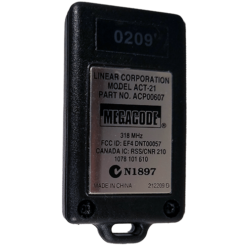 The Linear ACT-21A is a one-button keychain style remote. This remote operates at Linear’s MegaCode 318 MHz radio frequency. The ACT21A is compatible with Linear garage operators that program with a “Smart Learn” button. This remote will also work on other MegaCode and compatible receivers that program by pressing the remote button. THIS ITEM IS NOT BLOCK CODED and will not work on computer-controlled systems that require manual entry of the remote serial number. Linear radio controls are constructed with quality components and come with a 1-year factory warranty. If you need to enroll with serial numbers, use model ACT-21B.