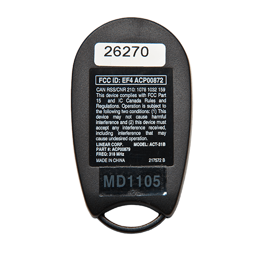 The Linear ACT-31B is a single button keychain style remote. This transmitter operates at 318MHz and features Linear’s MegaCode technology. These remotes are Block Coded and each one has an individual serial number. The ACT31B works on all Moore-O-Matic and Linear garage operators that program with a “Smart Learn” button. The ACT-31B also works with MegaCode and compatible Wiegand radio receivers. The button features a unique 10-second time out to prevent the remote from continuously transmitting if the button gets stuck. This remote comes supplied with two cr2016 batteries and a quick-disconnect keyring. Linear radio controls are made with quality materials and come with a one-year factory warranty.