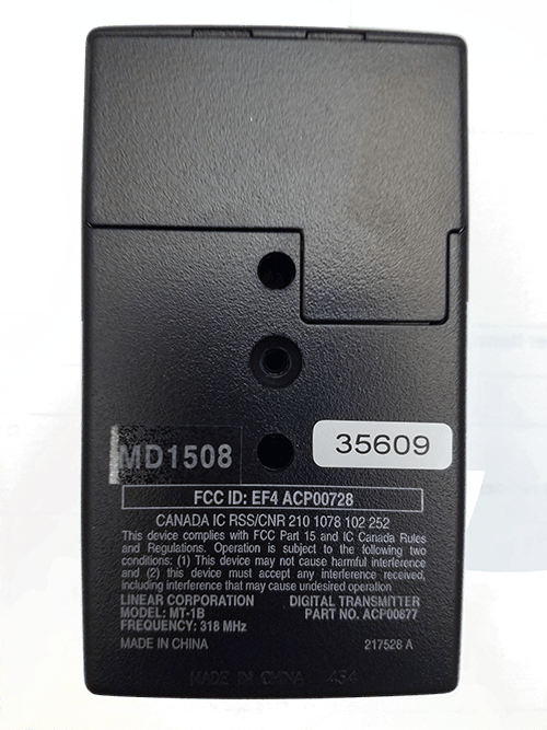 The Linear MT-1B is a single button visor style transmitter that operates at 318 MHz and is compatible with Linear garage operators and radio receivers with a smart “Learn Button”. The MT1B is Block Coded with external serial numbers for use in computer-controlled systems and stand-alone receivers requiring serial number enrollment.