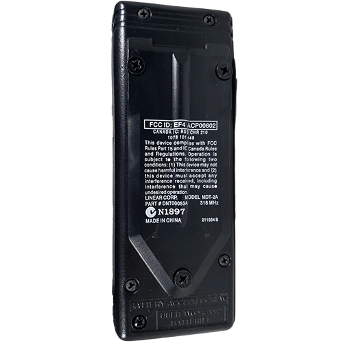 The Linear MDT-2A is a two-channel visor style remote that operates at 318 MHz and is works with Linear MegaCode garages and receivers with a “Learn Button”. This transmitter features 2 main buttons on the front plus an “extra” button on the top for easy access when your car visor is up. The MDT2A is NOT Block Coded with external serial numbers.