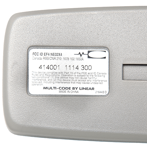 Multi-Code by Linear model 414001 is a four-button visor style remote. Linear/Nortek is an industry leader for gates, garages and access control. This Multi-Code gate/garage remotes has 2 sets of 10 dip switches for coding and operate at 300 MHz frequency. The receivers must be set properly to work with this 4 button Multi-Code model. These are compatible with gates, garages and any other automatic doors that have a 300 MHz Multi-Code receiver connected. This transmitter features easy access to the dip switches and battery with a notch at the bottom to open the battery cover with a coin or the supplied visor clip. Other size options available as well. See Compatibles section below for more gate and garage remote options.