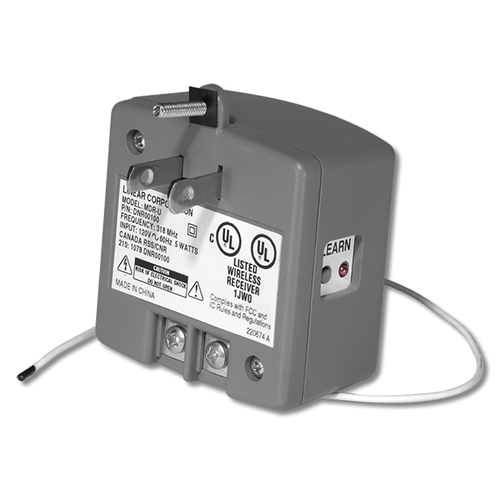 The Linear MDR-U is a plug-in style radio receiver. This receiver operates at 318 MHz and works with Linear MegaCode and compatible remotes. This versatile receiver can connect to any garage operator through the 2-wire input used by the existing wall button. The MDRU programs easily using a “Smart Learn” button. This receiver can hold up to 10 remotes and/or wireless keypads. Linear parts are made with quality components and come with a one-year warranty.