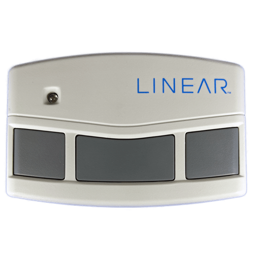 The Linear MTS3 is a three-button remote that operates at 318 MHz and works with Linear garages and radio receivers that program with a “Smart Learn” button. Each remote is pre-coded with its own individual code.